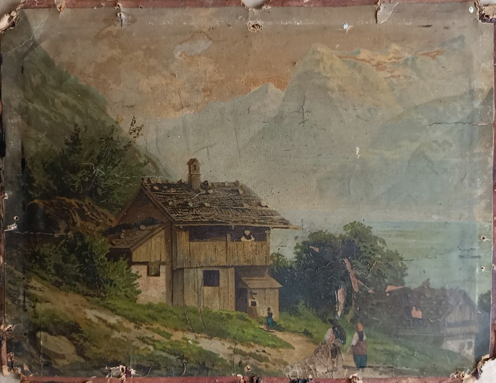 "Хижины у летнего горного озера" хромолитография Johann Wilhelm Lindlar 1880-е годы