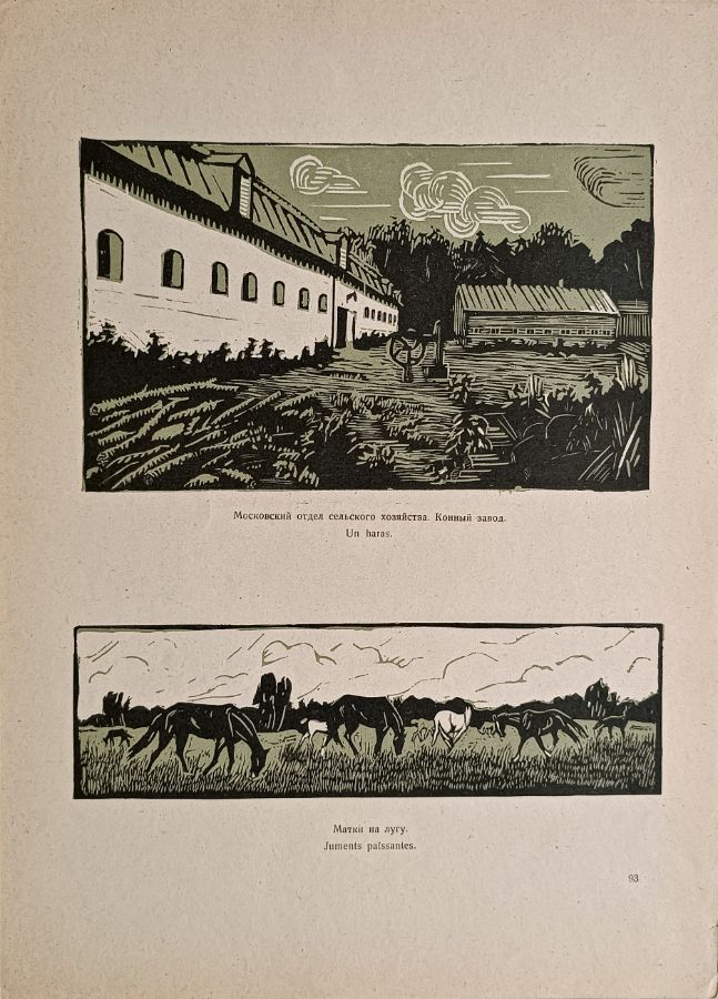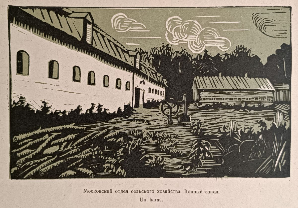 С.В. Образцов «Московский отдел сельского хозяйства. Конный завод», цветная линогравюра, 20х12,2 см