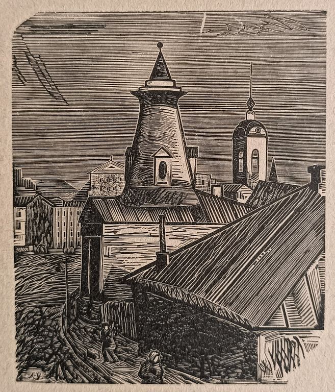 "Городской пейзаж" ксилография Усачев А.И. 1921 год