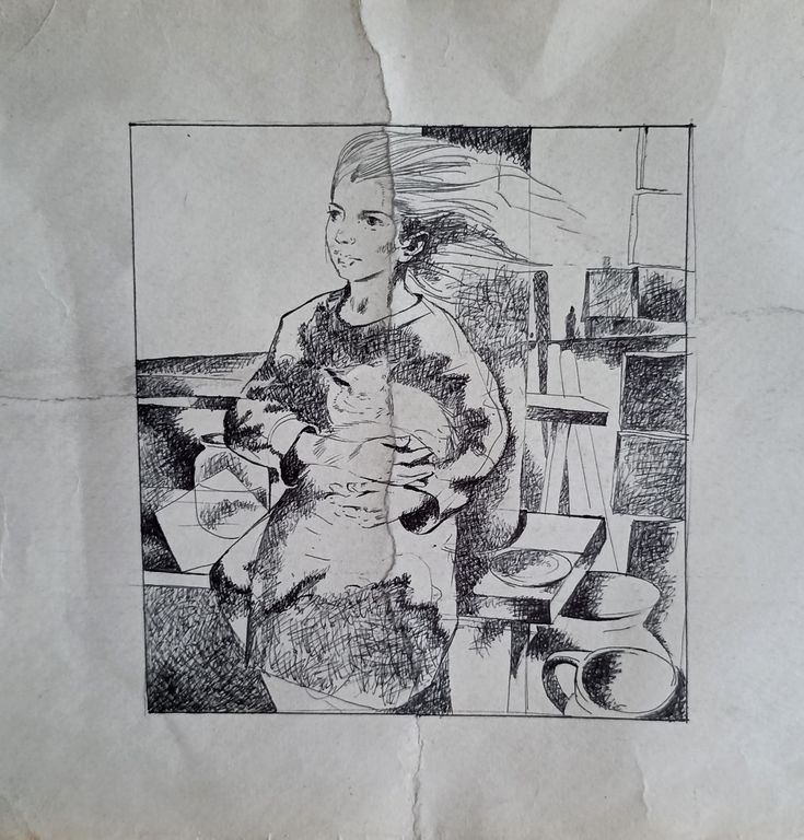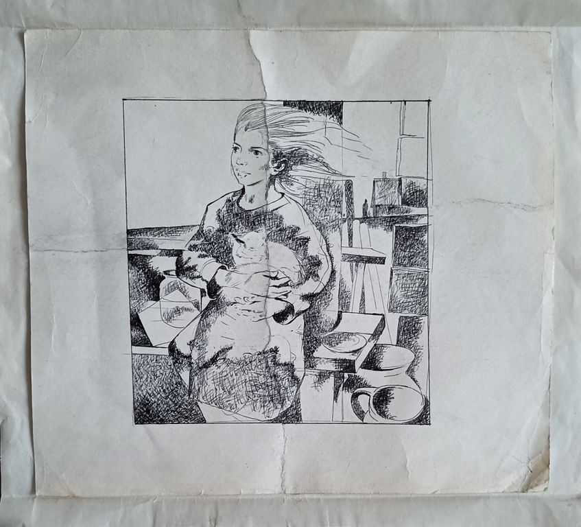 "Девочка и кот" бумага тушь Кравцов Г.Т. 1970-е годы