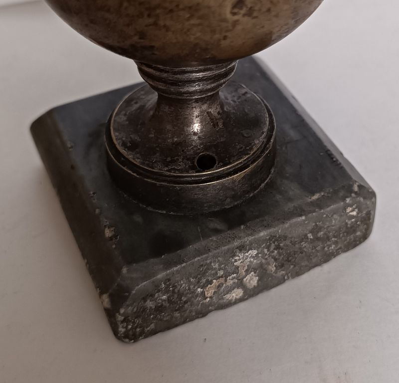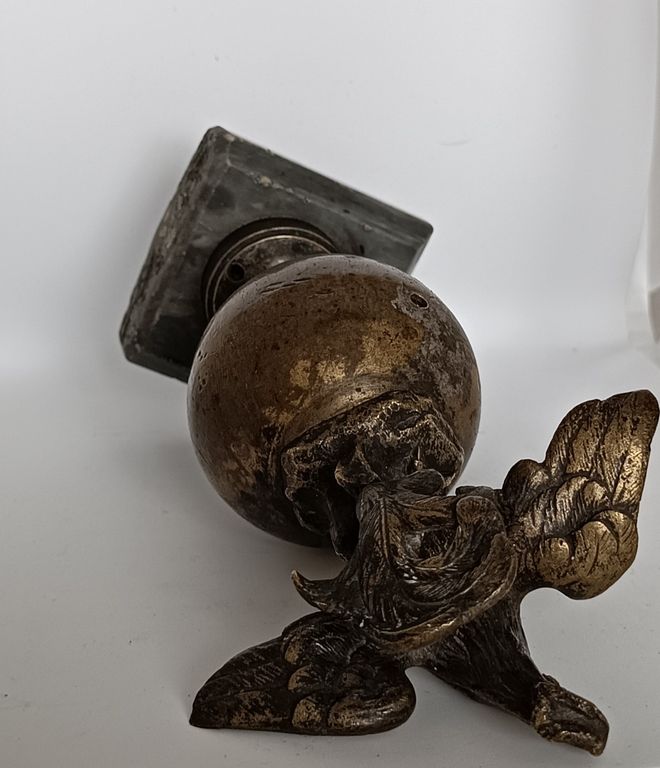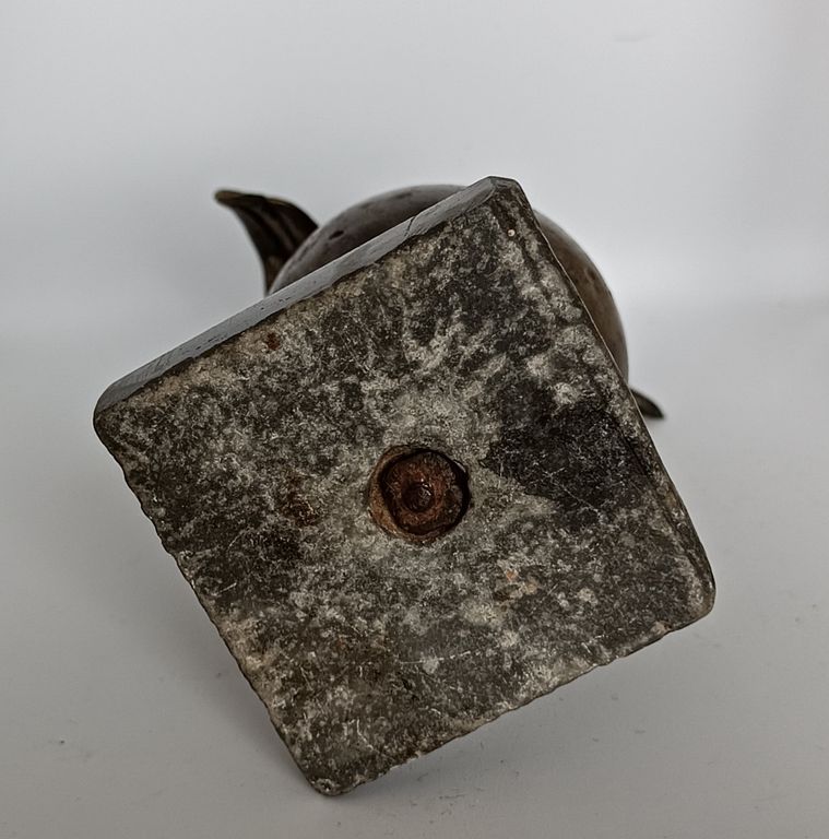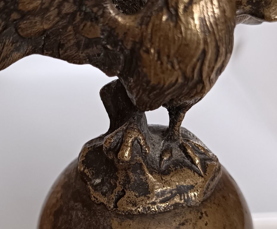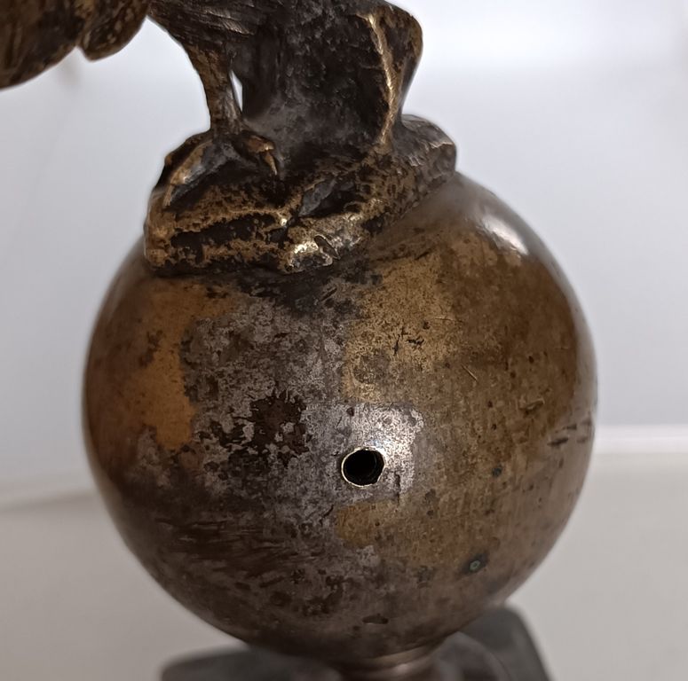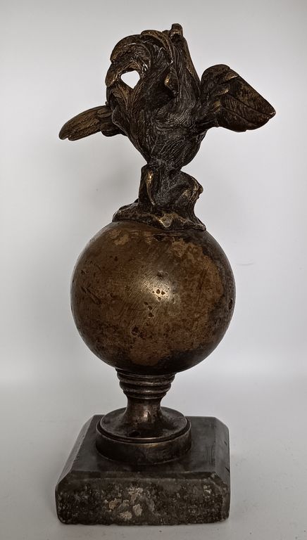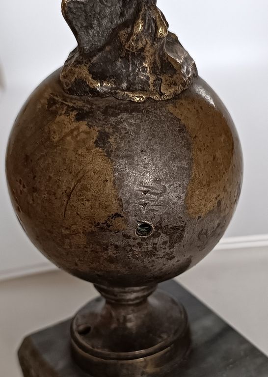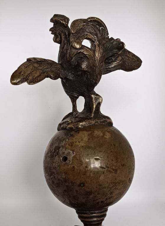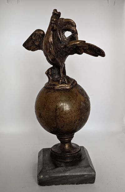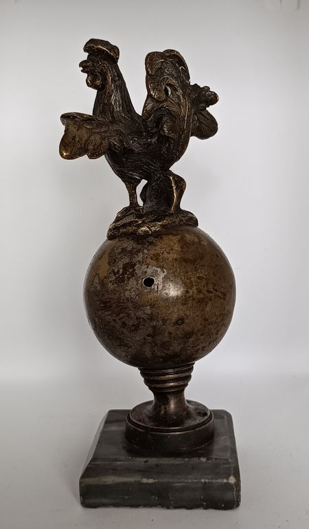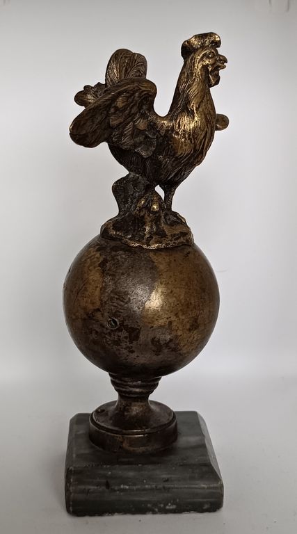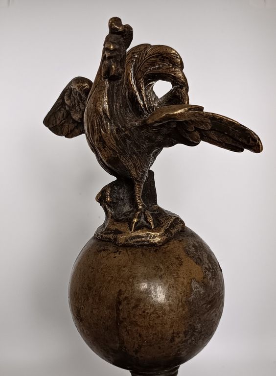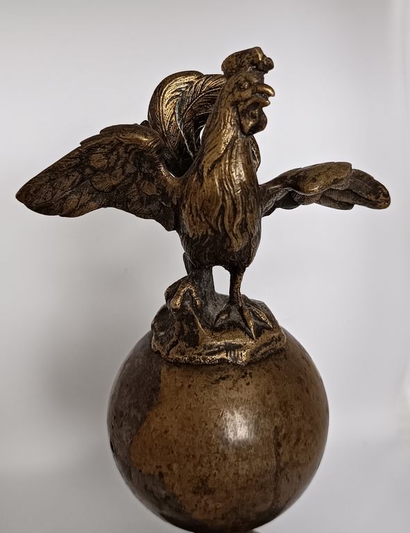 Такие фигуры в XIX веке во Франции имели не только декоративное значение, но и часто служили навершиями (фиалами) для знамен Национальной гвардии или государственных штандартов периода Июльской монархии (1830–1848 гг.). Петух, торжествующе стоящий на сфере (шаре), символизирует бдительность и победу. Ступенчатый переход от шара к мраморной базе (так называемая «ножка-балясина») выполнена в классическом стиле. Видны следы времени (патина, потертости), которые характерны для антикварной бронзы. Небольшое отверстие на шаре может быть технологическим или местом крепления недостающей детали (например, лавровой ветви).