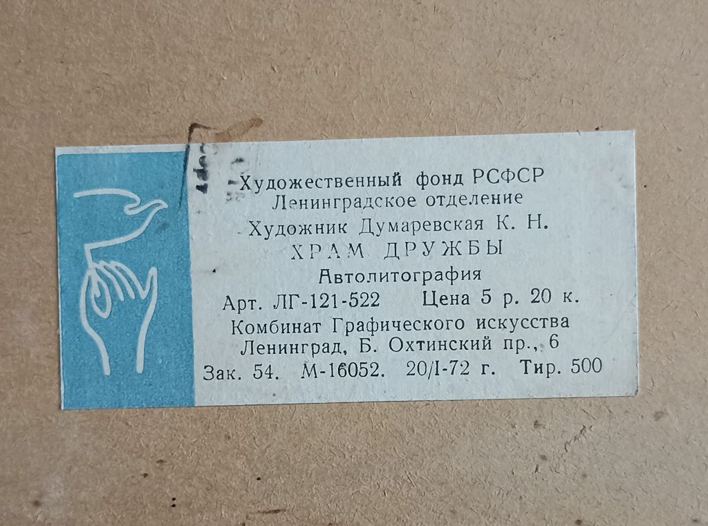 "Храм дружбы" автолитография Думаревская К.Н. 1972 год